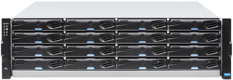 O EonStor DS1016R é um Storage iSCSI/FC/SAS 16 baias para HDDSSATA/SAS, padrão rack 3U, com controladora e fonte de alimentação redundantes, 2GB de RAM, 4 portas iSCSI LAN 1GbE, 2 portas de expansão SAS-12G. RAID 0, 1, 3, 5, 6, 10, 30, 50, Snapshot, Cache SSD e expansível até 448 discos.