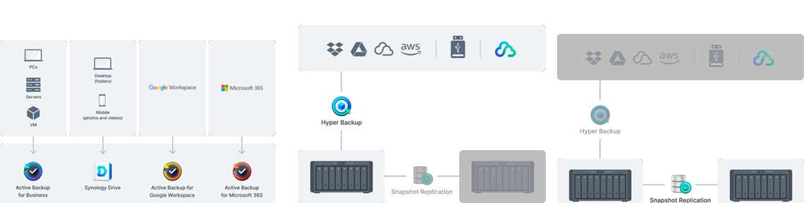 Proteja todos os dados, aplicativos e configurações em seus sistemas Synology com backups agendados abrangentes, incluindo backups bare-metal, em servidores locais e remotos, unidades externas ou destinos de armazenamento em nuvem, incluindo o Synology C2 Storage.