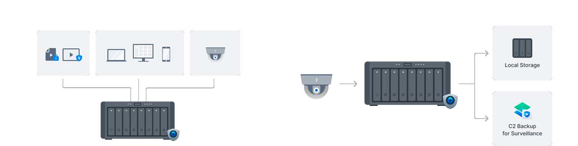 Proteja suas imagens de vigilância com um backup em nuvem robusto que suporta criptografia de ponta a ponta. Nossa solução de backup de vigilância em nuvem protege suas gravações do Surveillance Station, permitindo que você acesse, visualize, compartilhe e baixe as imagens por meio de um portal web conveniente. Garanta que seus dados permaneçam disponíveis mesmo que seu sistema local seja comprometido.