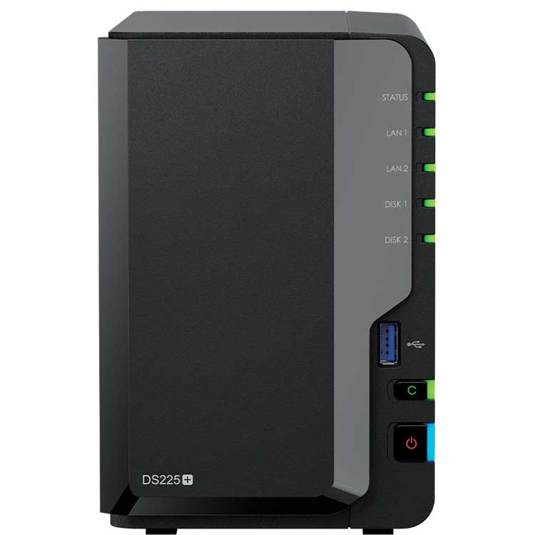 O DS225+ é um NAS de 2 baias para discos SATA, hot swappable, processador Intel Celeron 4-core, 2GB de memória DDR4, 2x portas USB e 2x conexões LAN. O server integra funções de armazenamento, backup, nuvem híbrida, gerenciamento de arquivos e vídeo vigilância.