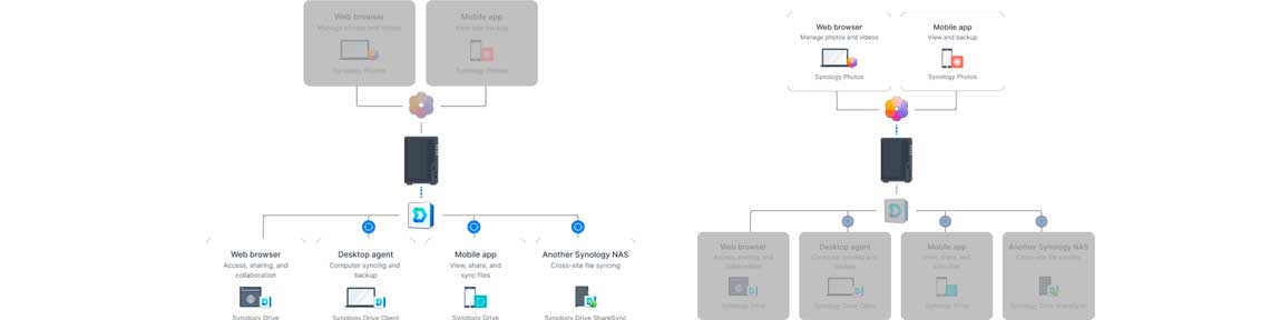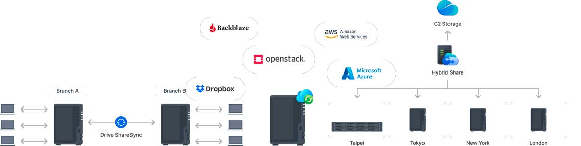 Mantenha os dados sincronizados automaticamente entre o Synology NAS e os principais provedores de nuvem, incluindo BackBlaze B2, Dropbox, Google Drive e Microsoft OneDrive. Suporte a vários protocolos, criptografia do lado do cliente e controles personalizáveis de sincronização e largura de banda permitem um gerenciamento de armazenamento eficiente em diversas plataformas.