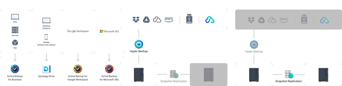 Proteja todos os dados, aplicativos e configurações em seus sistemas Synology com backups agendados abrangentes, incluindo backups bare-metal, em servidores locais e remotos, unidades externas ou destinos de armazenamento em nuvem, incluindo o Synology C2 Storage.