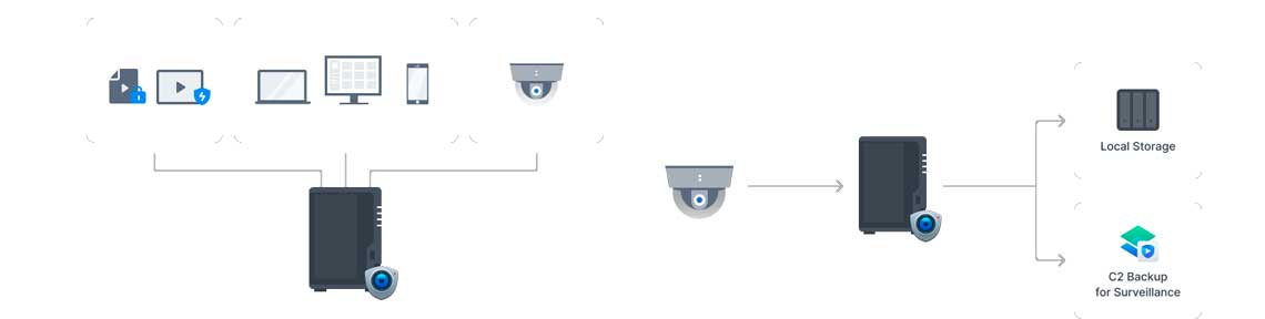 Proteja suas imagens de vigilância com um backup em nuvem robusto que suporta criptografia de ponta a ponta. Nossa solução de backup de vigilância em nuvem protege suas gravações do Surveillance Station, permitindo que você acesse, visualize, compartilhe e baixe as imagens por meio de um portal web conveniente. Garanta que seus dados permaneçam disponíveis mesmo que seu sistema local seja comprometido.