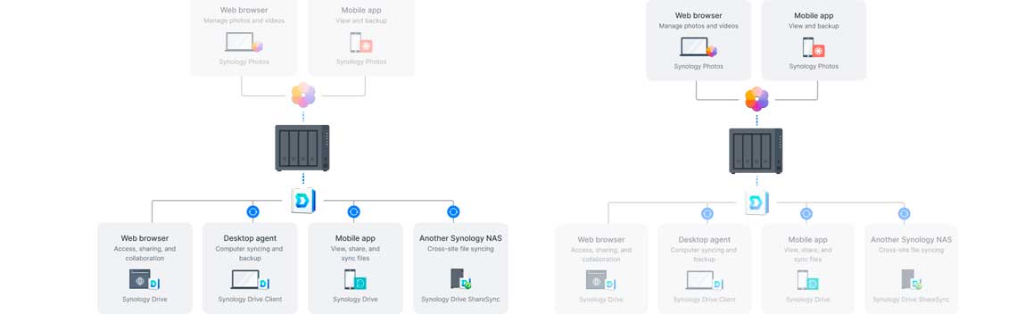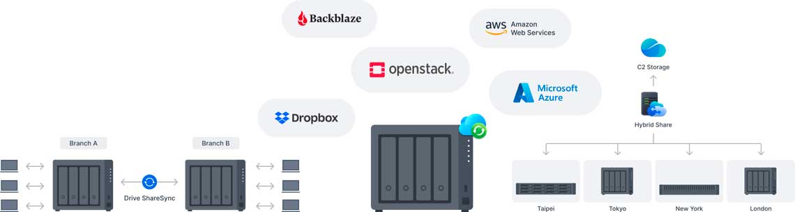 Mantenha os dados sincronizados automaticamente entre o Synology NAS e os principais provedores de nuvem, incluindo BackBlaze B2, Dropbox, Google Drive e Microsoft OneDrive. Suporte a vários protocolos, criptografia do lado do cliente e controles personalizáveis de sincronização e largura de banda permitem um gerenciamento de armazenamento eficiente em diversas plataformas.