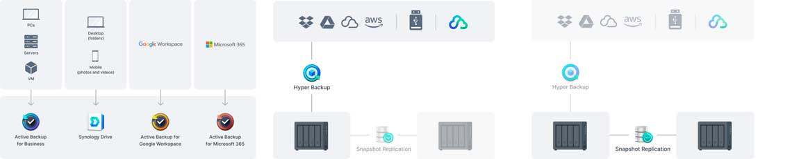 Proteja todos os dados, aplicativos e configurações em seus sistemas Synology com backups agendados abrangentes, incluindo backups bare-metal, em servidores locais e remotos, unidades externas ou destinos de armazenamento em nuvem, incluindo o Synology C2 Storage.
