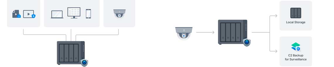 Proteja suas imagens de vigilância com um backup em nuvem robusto que suporta criptografia de ponta a ponta. Nossa solução de backup de vigilância em nuvem protege suas gravações do Surveillance Station, permitindo que você acesse, visualize, compartilhe e baixe as imagens por meio de um portal web conveniente. Garanta que seus dados permaneçam disponíveis mesmo que seu sistema local seja comprometido.