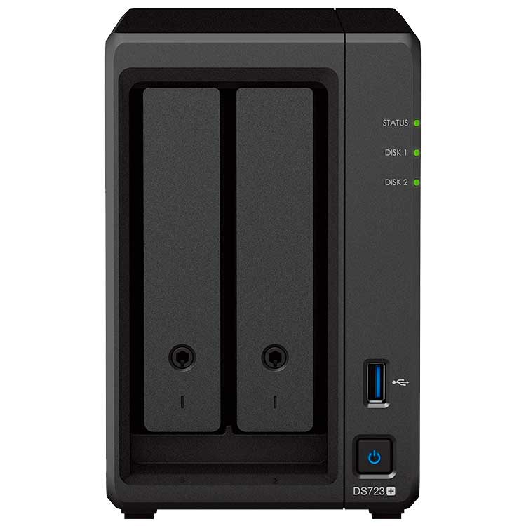O DS723+ é um storage NAS de 2 baias para discos SATA, hot swappable, processador AMD Ryzen, 2GB de memória DDR4 (expansível até 32GB), 2x slots NVMe, 2x portas LAN, 1x porta USB e 1x porta eSATA. Servidor de armazenamento com recursos de backup, nuvem híbrida e sistema de vigilância. É ideal para ambientes, como residências, pequenas empresas e escritórios.