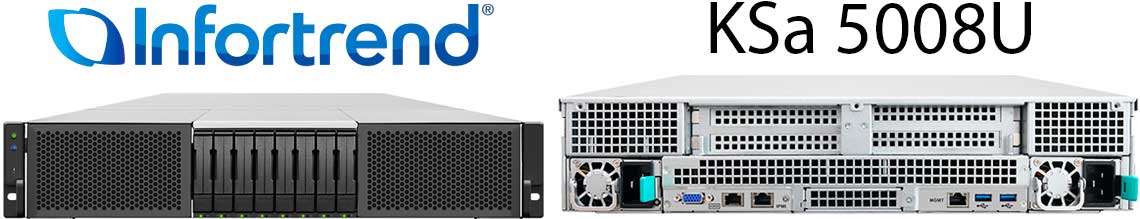 O KSa 5008U da Infortrend é um Enterprise Cloud Storage com 8 baias para discos SATA e memórias NVMe, processadores escaláveis AMD EPYC, 24 slots de memória DDR5 DIMM, padrão 192 GB, expansível até 1.5TB DDR5 RDIMM, 3x portas de rede LAN e 2x entradas USB. Ele oferece recursos de nuvem, como escalabilidade e confiabilidade, permitindo que as empresas executem aplicativos nativos da nuvem e tradicionais.