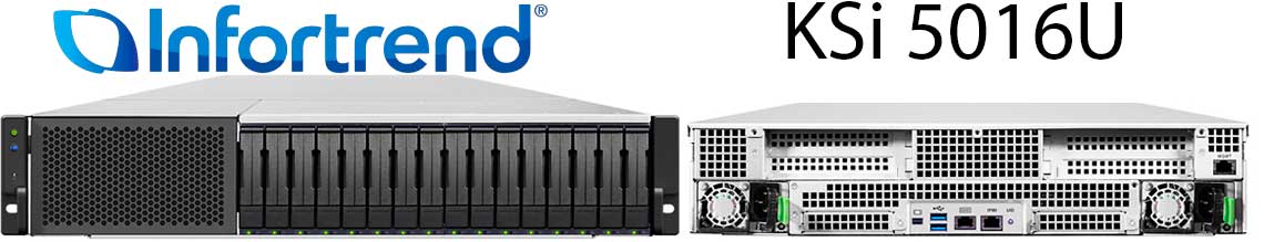 O KSi 5016U da Infortrend é um Enterprise Cloud Storage com 16 baias para discos SATA e memórias NVMe, processadores escaláveis Intel Xeon, 32 slots de memória DDR5 DIMM, padrão 128 GB, expansível até 2 TB DDR5 RDIMM, 3x portas de rede LAN e 2x entradas USB. Ele oferece recursos de nuvem, como escalabilidade e confiabilidade, permitindo que as empresas executem aplicativos nativos da nuvem e tradicionais.