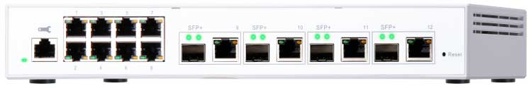 Switch QNAP QSW-M408-4C 10GbE de camada 2 gerenciável de 12 portas sendo 4 portas 10GE SFP+/RJ45 e 8 portas 1GbE (RJ45) de fácil utilização e oferece implementação flexível em ambientes de rede híbridos de alta velocidade. Switch compatível com o protocolo RSTP (Rapid Spanning Tree Protocol).