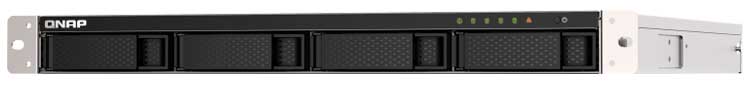 NAS rackmount com 4 baias p/ hard disks SATA, até 64TB (4x HDD 16TB), processador Intel Quad-core 2.0 GHz, duas portas LAN 2,5GbE ethernet e um slot PCIe. Oferece sistema de criptografia AES 256 bits, snapshots para registrar o status do sistema/dados e armazenamento em camadas Qtier (tiering).