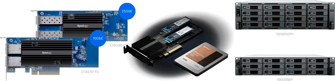 O RS2825RP+ pode ser configurado de forma flexível para atender às necessidades em evolução por meio de rede mais rápida, cache SSD local ou maior armazenamento.