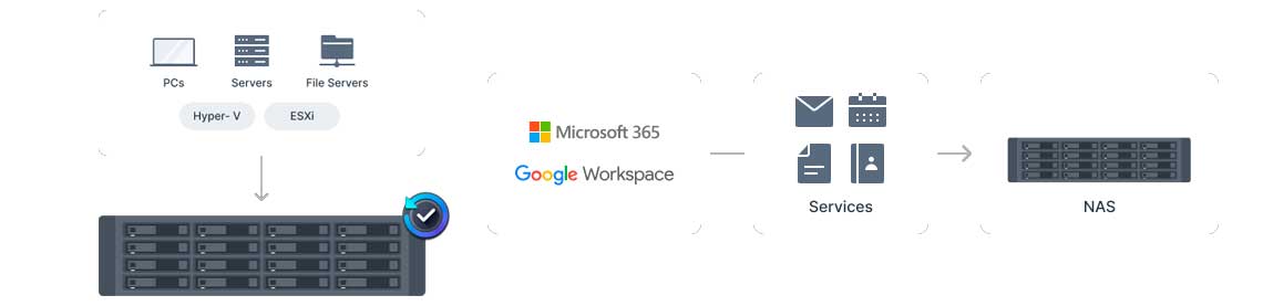 Faça backup com segurança de uma ampla gama de sistemas, incluindo endpoints Windows, Mac e Linux, máquinas virtuais VMware® e Hyper-V® e servidores Synology.