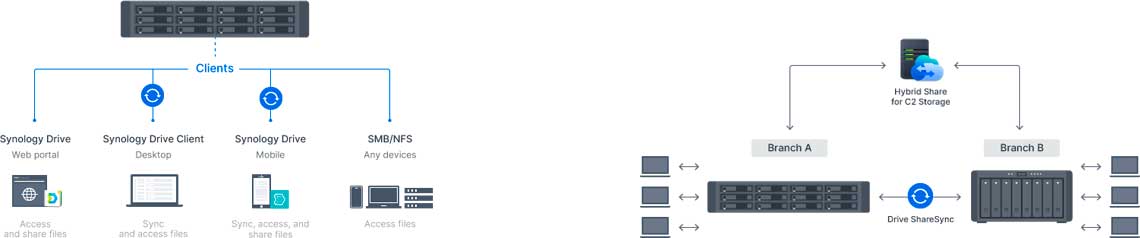O Synology Drive ShareSync permite a sincronização unidirecional ou bidirecional entre vários servidores para que todos os membros da equipe possam acessar o mesmo conjunto de dados no servidor mais próximo.