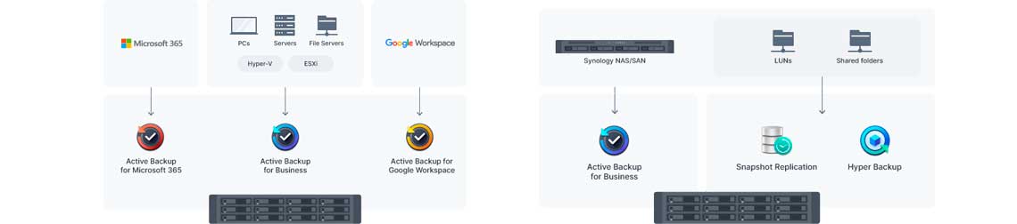 É importante proteger contas do Microsoft 365 e do Google Workspace mantendo cópias off-line completas de informações e configurações cruciais com o Active Backup para Microsoft 365 e o Active Backup para Google Workspace.