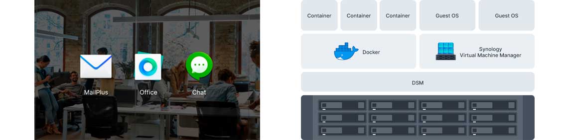 Teste com segurança novos pacotes, software e aplicativos em um ambiente isolado usando o Docker e o Synology Virtual Machine Manager (VMM) — um hypervisor para Windows, Linux e Virtual DSM.