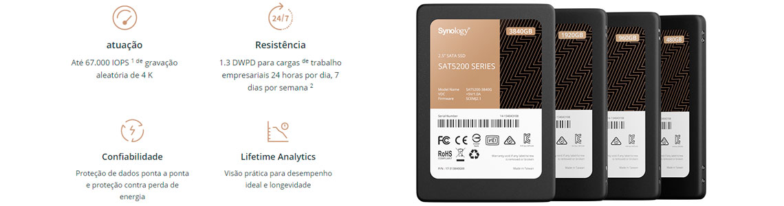 O SSD Synology SAT5200 SATA apresenta um I/O com desempenho estável enquanto diminui a latência de serviços e aplicativos de missão crítica. Foi projetado para lidar com cargas de trabalho combinadas e intensivas em tempo integral (24 horas por dia 7 dias por semana) sem que a resistência se comprometa, fornecendo uma experiência de armazenamento otimizada para sistemas Synology oferecendo interrupções mínimas durante o serviço.