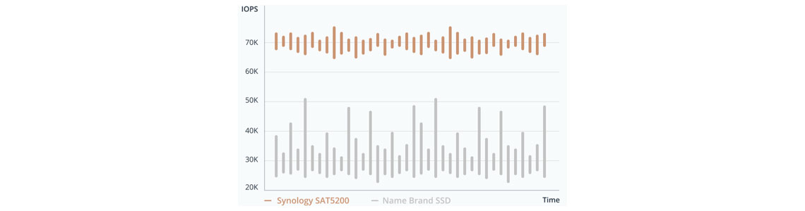 Projetado para ambientes exigentes, o Synology SAT5200 atende à necessidades de bancos de dados de processamento de transações online (OLTP) e implantações de virtualização, oferecendo alto desempenho estável de até 67.000 IOPS de gravação aleatória 4K, permitindo que as empresas melhorem a infraestrutura de armazenamento existente.