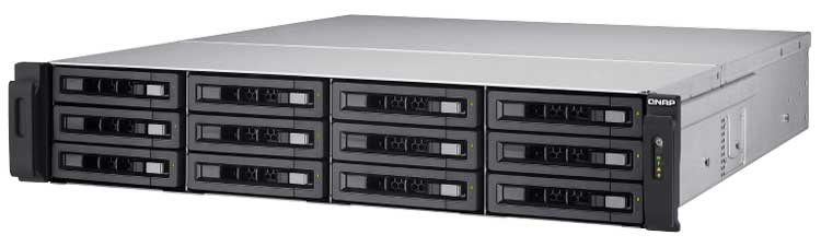Qnap TES-1885U - Storage baseado em FreeBSD e sistema de arquivos ZFS para 12 hard disks SATA/SAS. Com 4 portas de rede gigabit e 2 SFP+ 10GbE, arranjos RAID-Z, fontes redundantes e cache SSD, o servidor NAS suporta deduplicação, snapshot e tiering de dados.