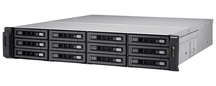 TS-EC1280U-RP Qnap - NAS storage 12 baias p/ discos SATA hot swappable, rackmount com 4 portas LAN, link aggregation / MPIO e 2 fontes redundantes. Escalável, com thin privisioning, arranjos RAID, serviços iSCSI, integração AD e LDAP.